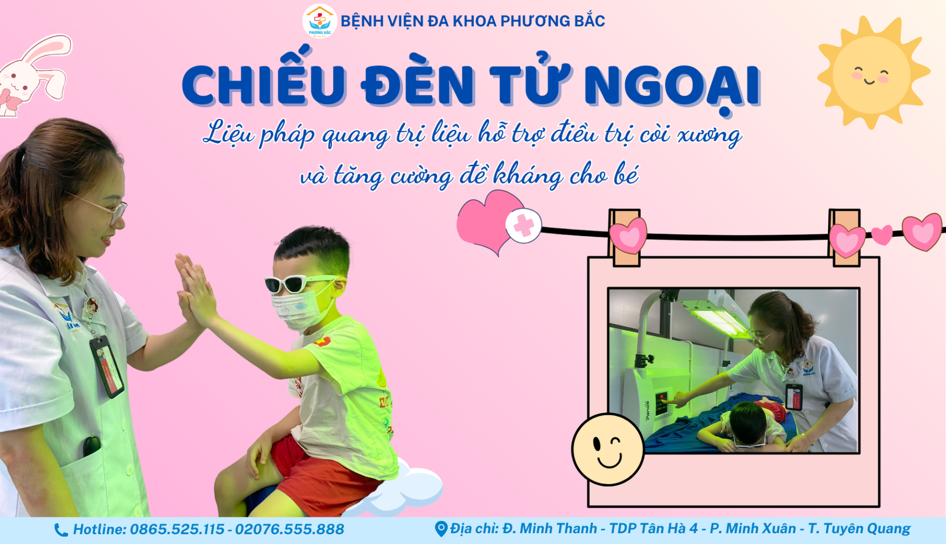 Với sự kết hợp hài hòa giữa y học cổ truyền và y học hiện đại, chiếu đèn tử ngoại tại BVĐK Phương Bắc không chỉ hỗ trợ điều trị vàng da sơ sinh, mà còn phòng ngừa còi xương, tăng cường miễn dịch, cải thiện bệnh da liễu, hỗ trợ điều trị rụng tóc thành đám… giúp trẻ phát triển toàn diện và khỏe mạnh.