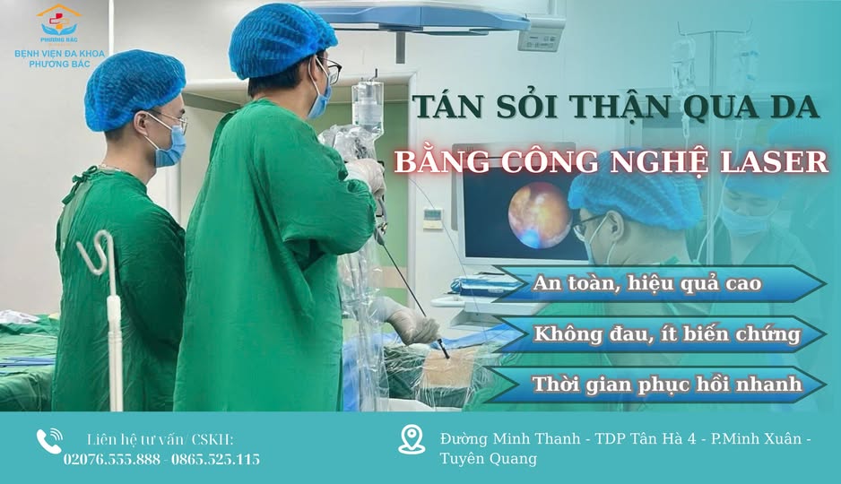 Tại Bệnh viện đa khoa Phương Bắc phẫu thuật nội soi tán sỏi thận qua da bằng laser được thực hiện thường xuyên bởi các chuyên gia, bác sỹ có trình độ chuyên môn cao, dày dặn kinh nghiệm, cùng hệ thống trang thiết bị, máy móc hiện đại giúp quá trình phẫu thuật đạt hiệu quả tối ưu nhất, sau phẫu thuật người bệnh được chăm sóc tận tình, chu đáo bởi các điều dưỡng viên chuyên nghiệp.